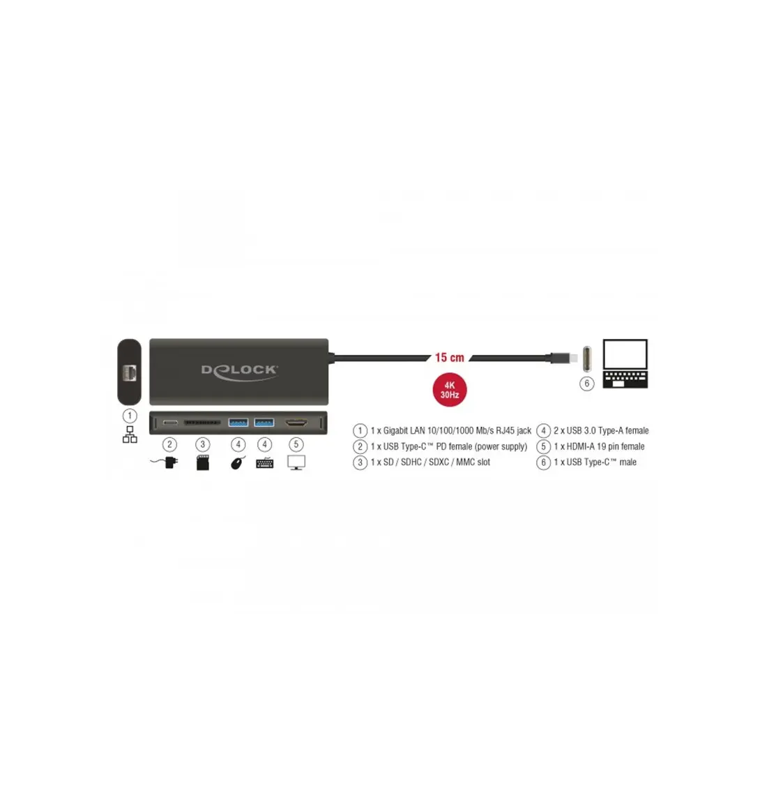Questa docking station Delock può essere collegata ad un computer con una porta USB-C™ Alt-Mode o Thunderbolt™ 3 e fornisce varie interfacce. Può essere utilizzato un display per l'uscita HDMI. Due porte USB integrate di Tipo-A consentono l'utilizzo di periferiche e connessioni di rete gigabit, così come un lettore di schede SD, che ne completa le caratteristiche. Con un alimentatore USB-C™, laptop quali Macbook o Chromebook possono essere caricati durante il funzionamento.