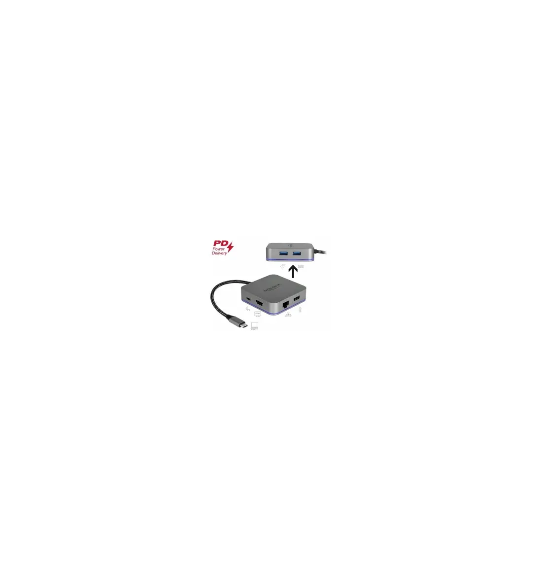 Questa docking station Delock può essere collegata a un dispositivo mobile con una porta USB-C™ DP Alt Mode o Thunderbolt™ 3 e fornisce diverse interfacce. Un monitor può essere utilizzato all'uscita HDMI. Tre porte USB integrate consentono l'uso di periferiche. La porta di rete gigabit consente la connessione alla rete.
