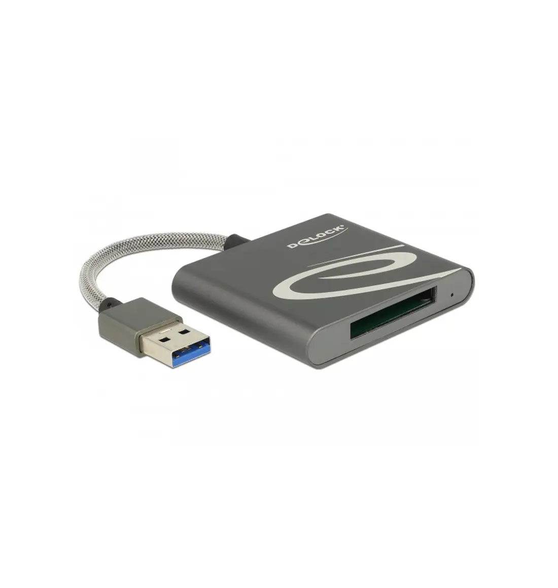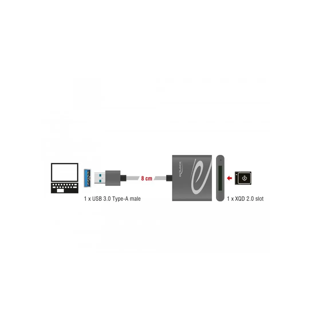 Il lettore di schede Delock può essere utilizzato per la lettura e scrittura schede di memoria XQD. Questo lettore di schede può essere collegato ad un PC o laptop tramite l'interfaccia USB Tipo-A.
