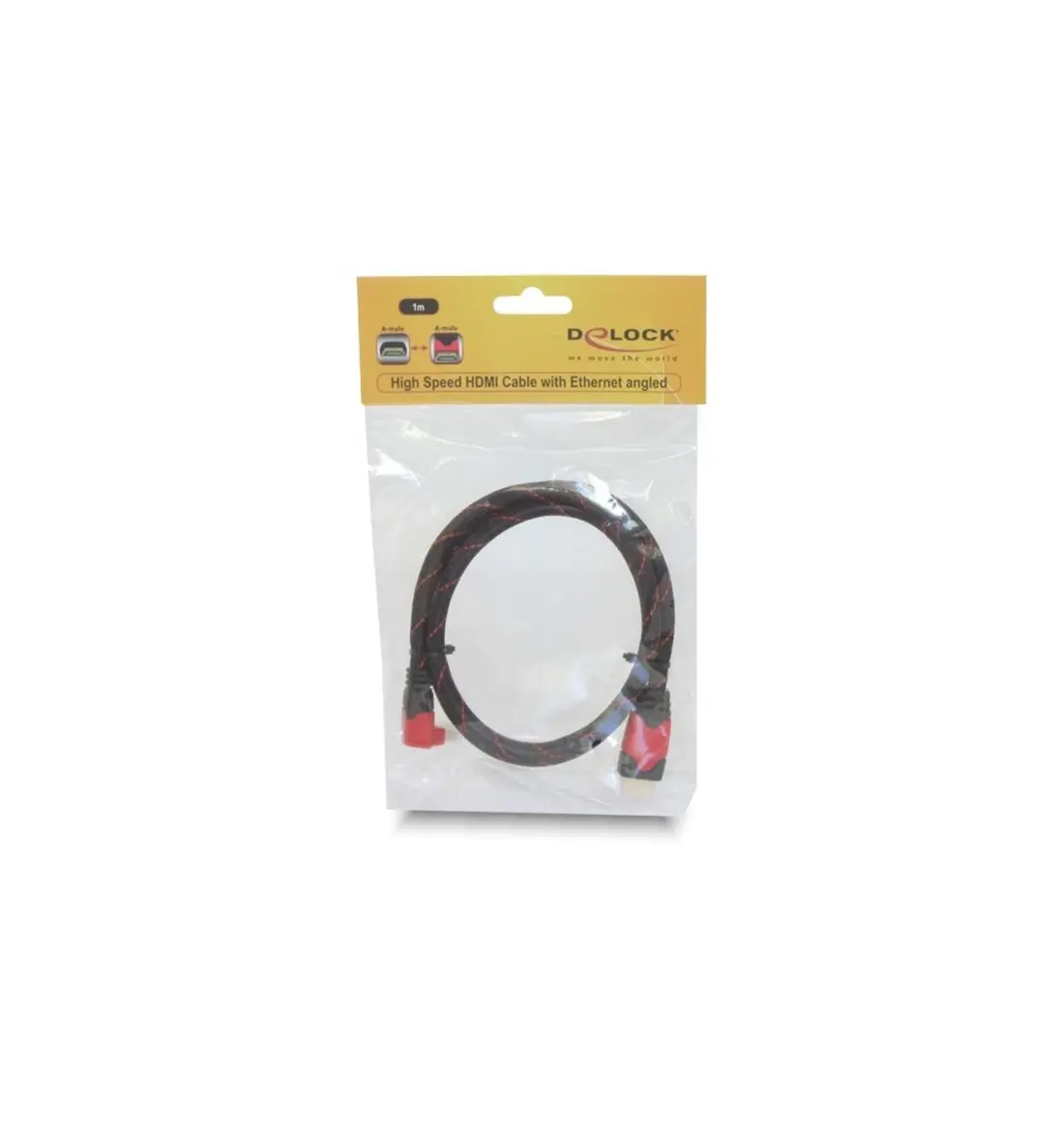 This High Speed HDMI with Ethernet cable by Delock complies with the latest HDMI standard and combines fast data transfer as well as audio-/ video- and Ethernet connection. Thus you can connect e.g. your PC or o DVD / Blu-ray drive to a monitor or TV. The angled connector helps to reach also a HDMI port which is difficult to access. The HDMI-A interface is downwards compatible to its forerunners and enables you to use your existing devices.