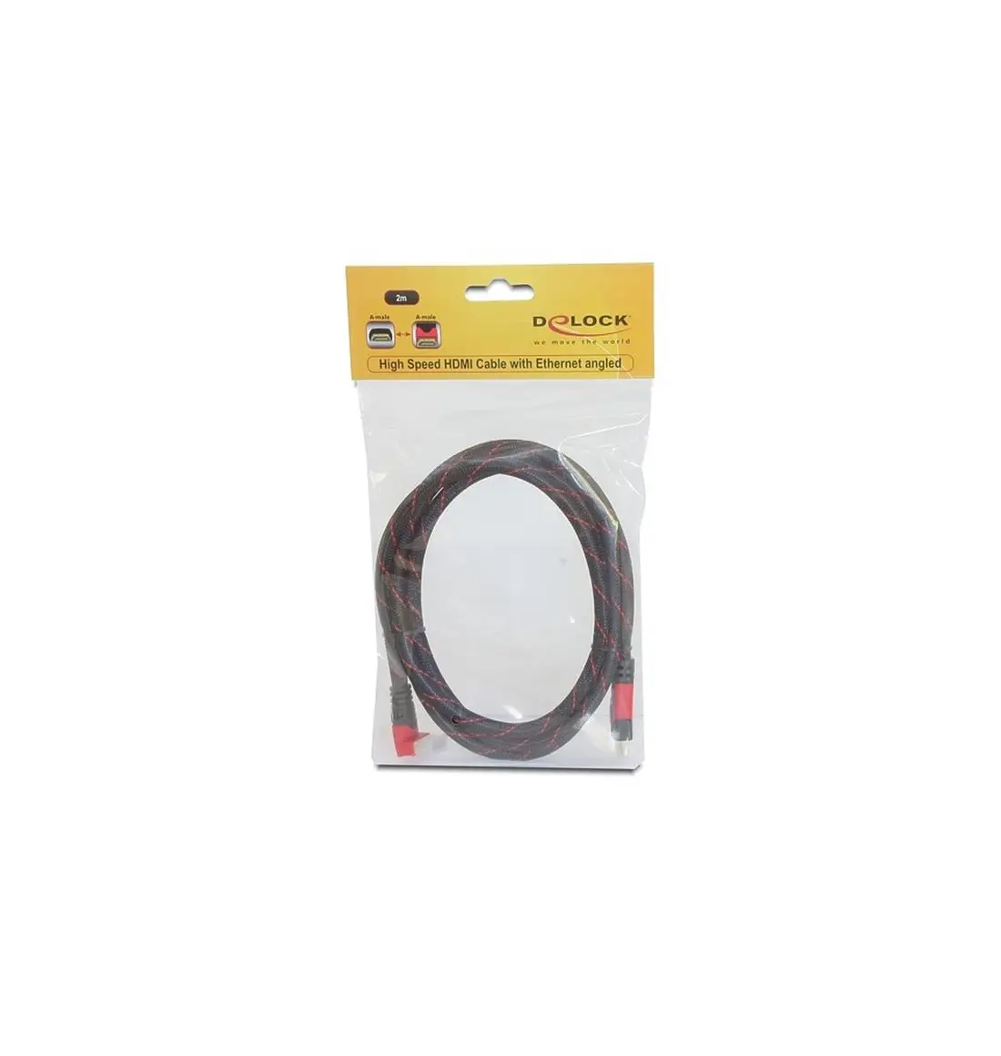 This High Speed HDMI with Ethernet cable by Delock complies with the latest HDMI standard and combines fast data transfer as well as audio-/ video- and Ethernet connection. Thus you can connect e.g. your PC or o DVD / Blu-ray drive to a monitor or TV. The angled connector helps to reach also a HDMI port which is difficult to access. The HDMI-A interface is downwards compatible to its forerunners and enables you to use your existing devices.