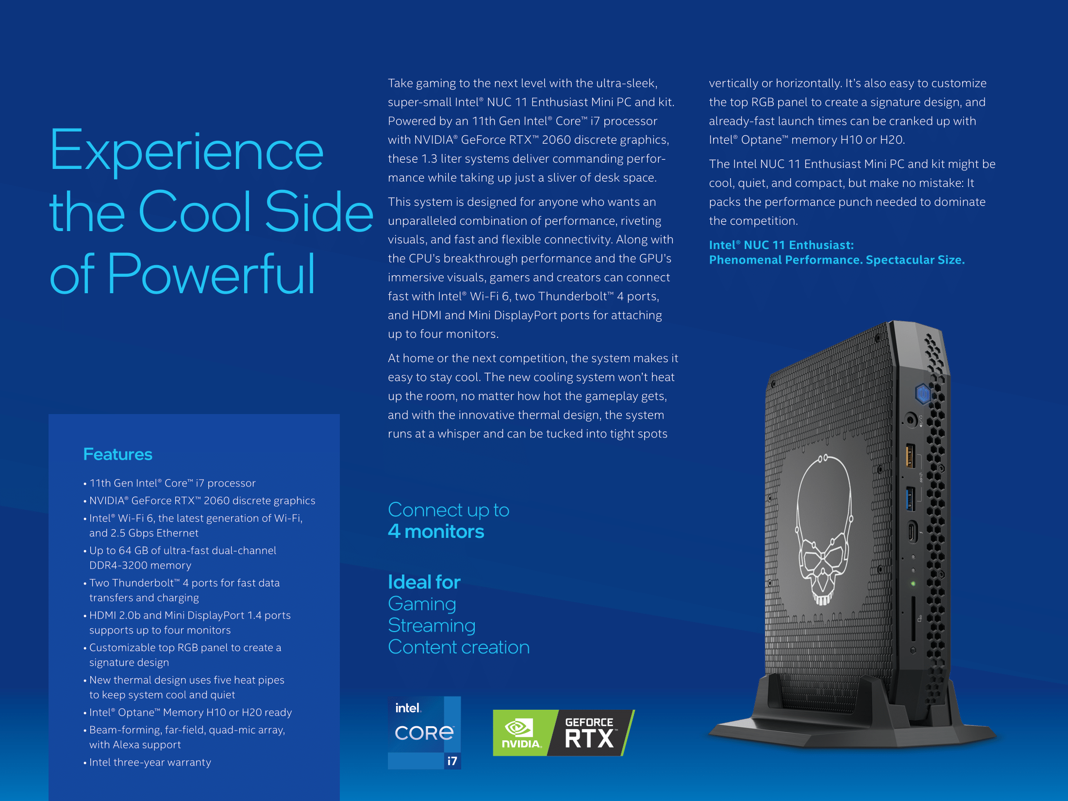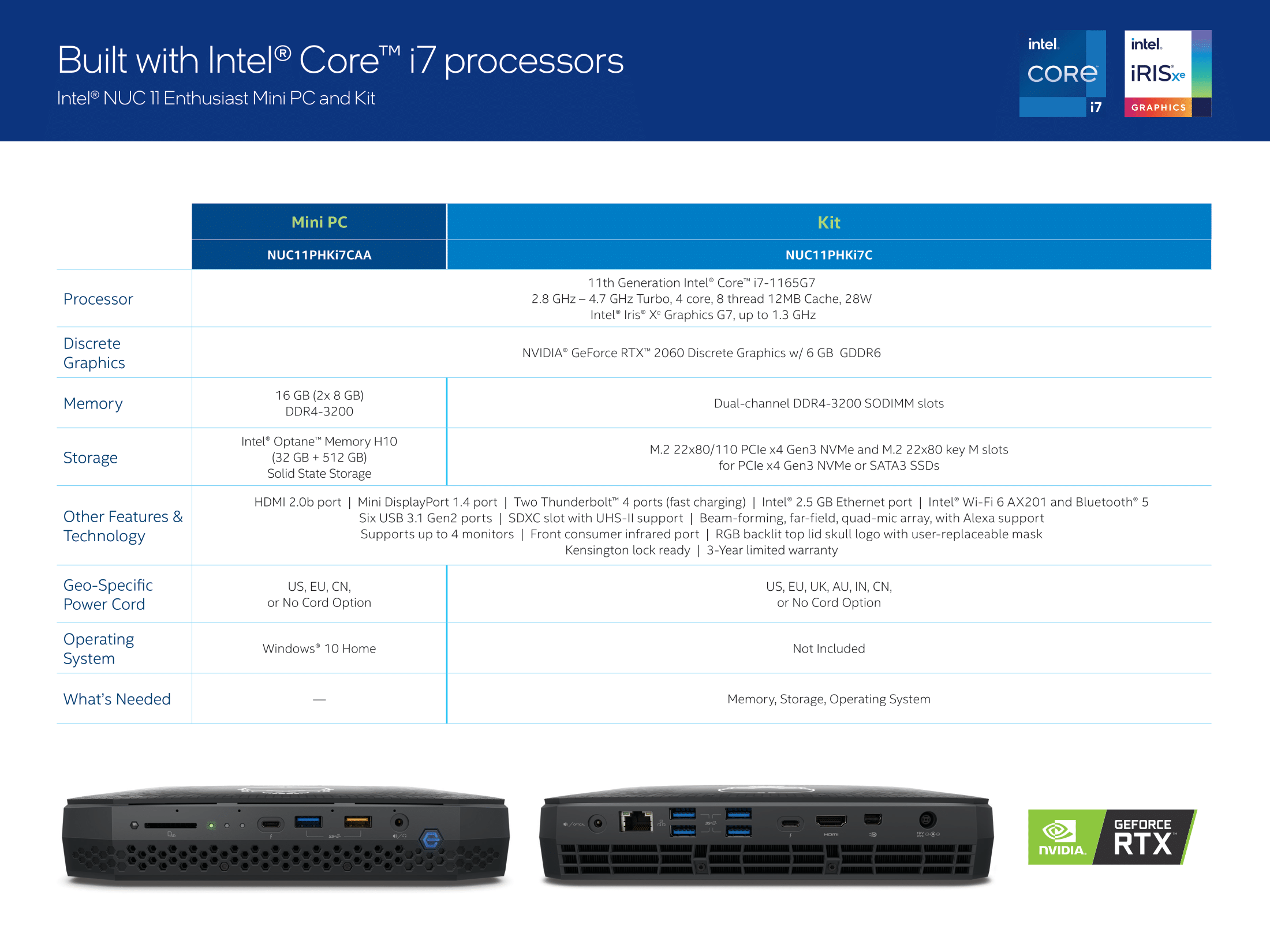 Intel NUC Undicesima Gen., Fam PHANTOM CANYON, CPU i7, GPU RTX 2060. Cod: NUC11PHKi7C